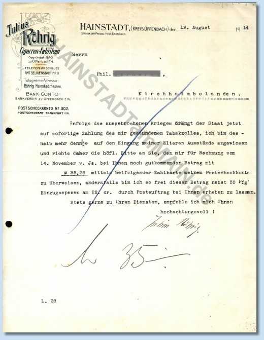 Rechnung der Cigarren-Fabriken Julius Röhrig aus Hainstadt von 1914
